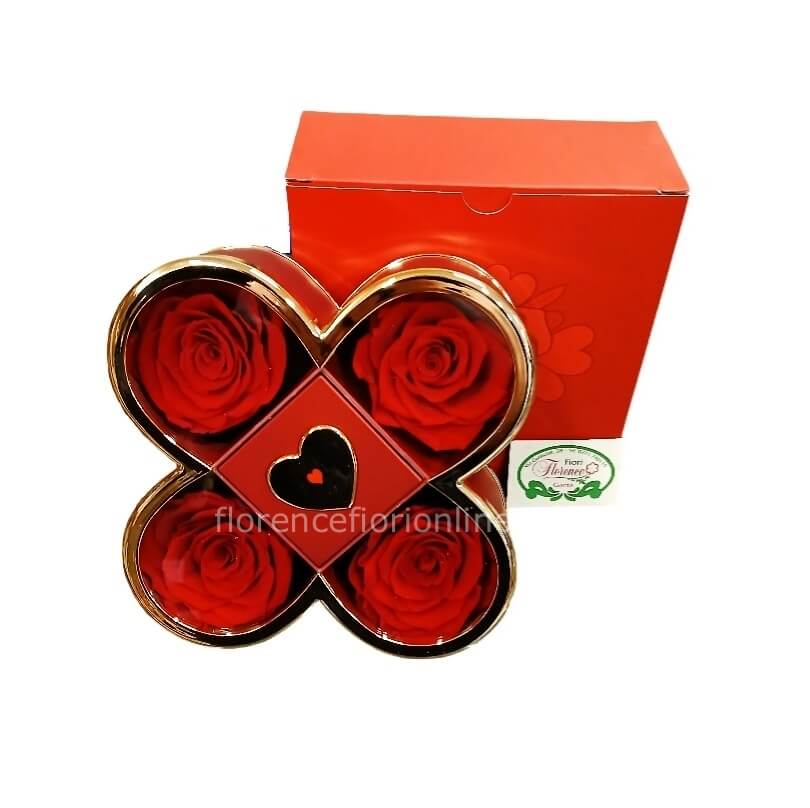 Elegante cofanetto a forma di quadrifoglio da 20 cm con 4 rose rosse stabilizzate, un regalo raffinato che dura nel tempo e non richiede manutenzione.
