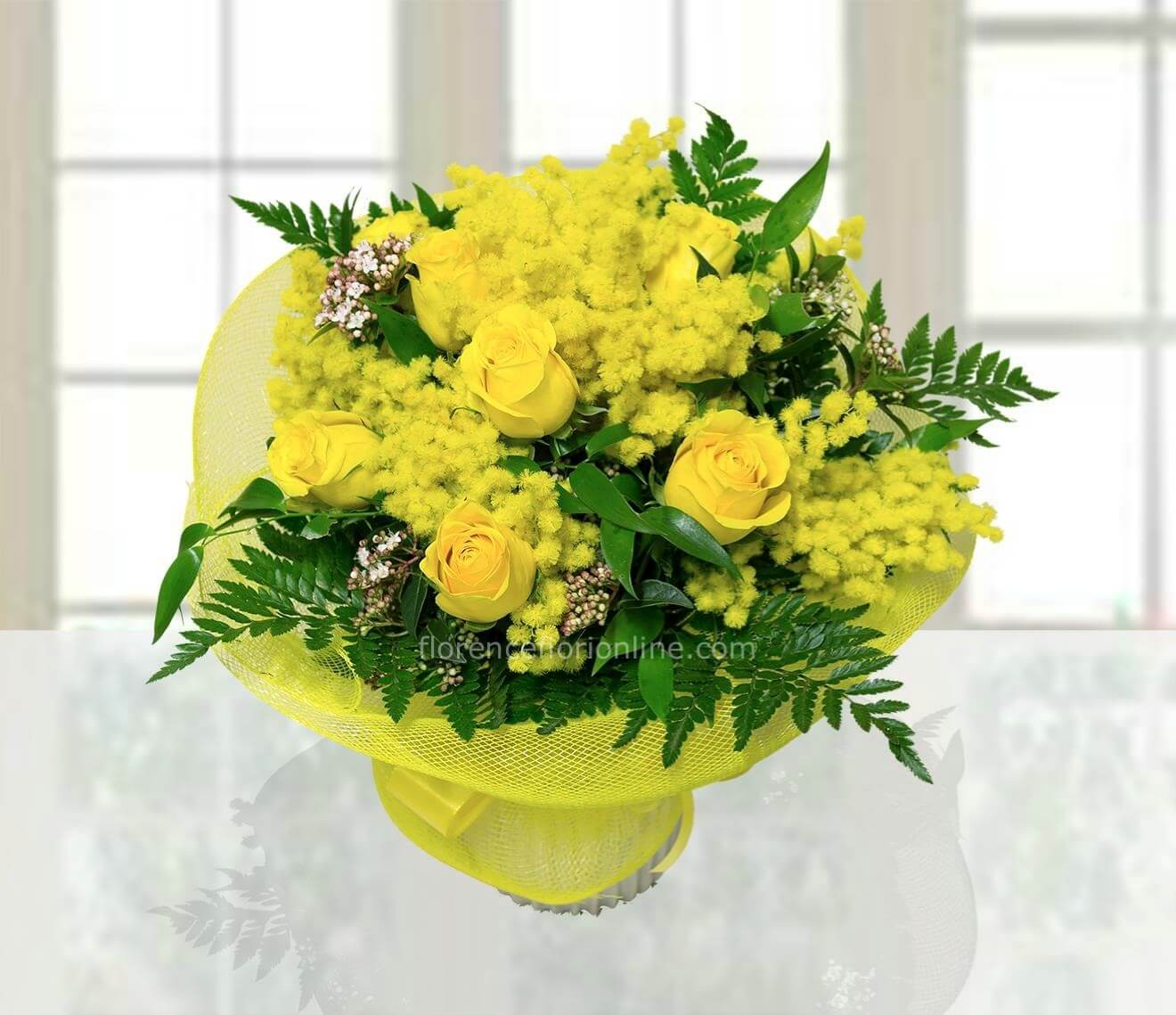 Le rose gialle simboleggiano gioia e amicizia, mentre la mimosa aggiunge un tocco di eleganza e freschezza. Utilizziamo solo fiori freschissimi, selezionati con cura, per assicurarti un prodotto che duri nel tempo e porti un sorriso sul volto di chi lo riceve.