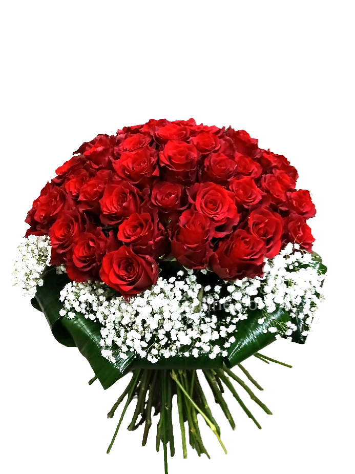 Splendido bouquet composto da 50 rose rosse fresche, disposte in modo armonioso e arricchite da nebbiolina bianca e verde decorativo, per un effetto elegante e scenografico.