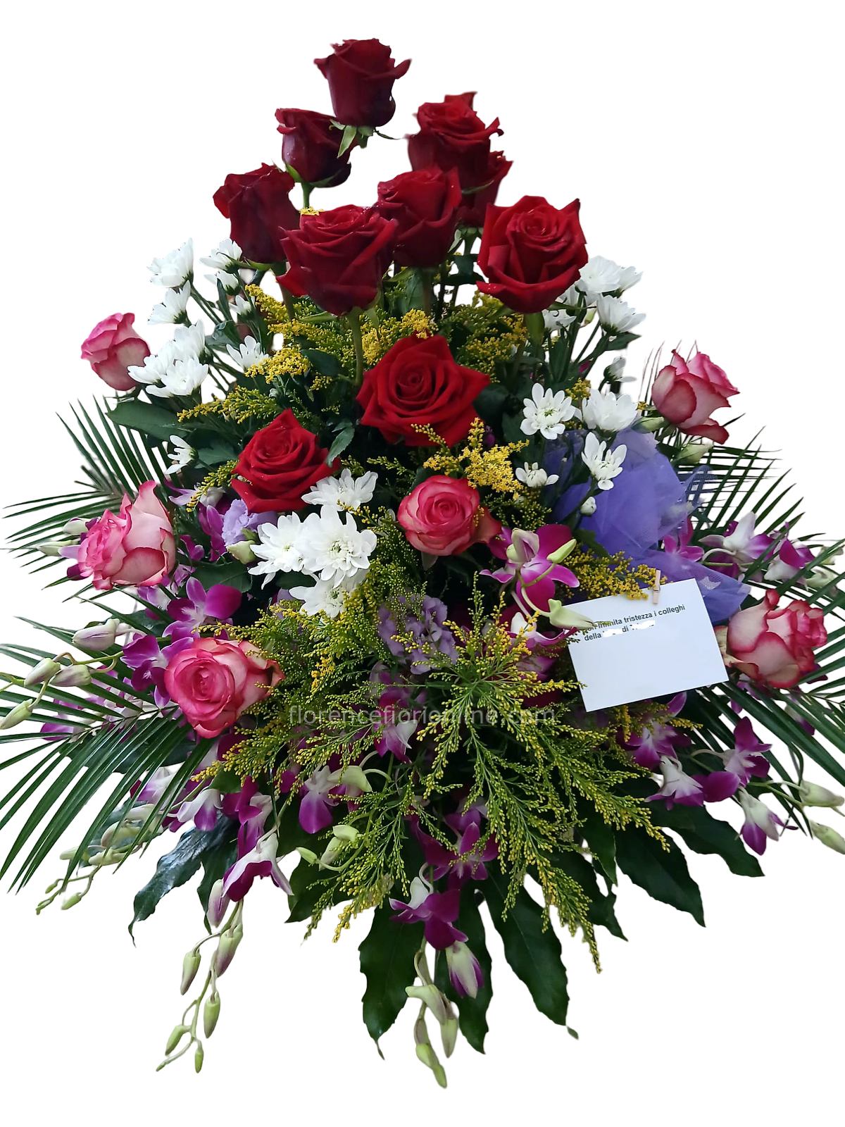 Composizione funebre su spugna con rose e orchidee. Una creazione elegante e di grande raffinatezza, pensata per esprimere cordoglio e vicinanza con delicatezza. La composizione è realizzata su base in spugna idrica, che mantiene i fiori freschi più a lungo, e unisce la classicità delle rose alla bellezza esotica delle orchidee. Perfetta come ultimo saluto, questa composizione trasmette calore, eleganza e rispetto.