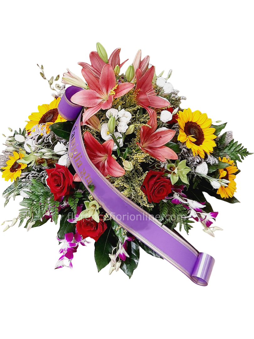 La nostra composizione funebre in spugna è realizzata con fiori assortiti freschi come rose, girasoli, orchidee e fiori del periodo, selezionati per garantire armonia, eleganza e durata nel tempo. Ogni creazione viene allestita su spugna idratata, così da mantenere i fiori freschi più a lungo e offrire un omaggio dignitoso e curato per accompagnare l’ultimo saluto. Perfetta per funerali, cerimonie commemorative e per esprimere vicinanza e cordoglio in modo sobrio e rispettoso.