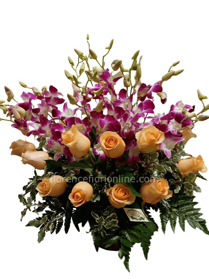 | Composizione in cesto con orchidee + 15 rose gialle Cod. 12434 |
