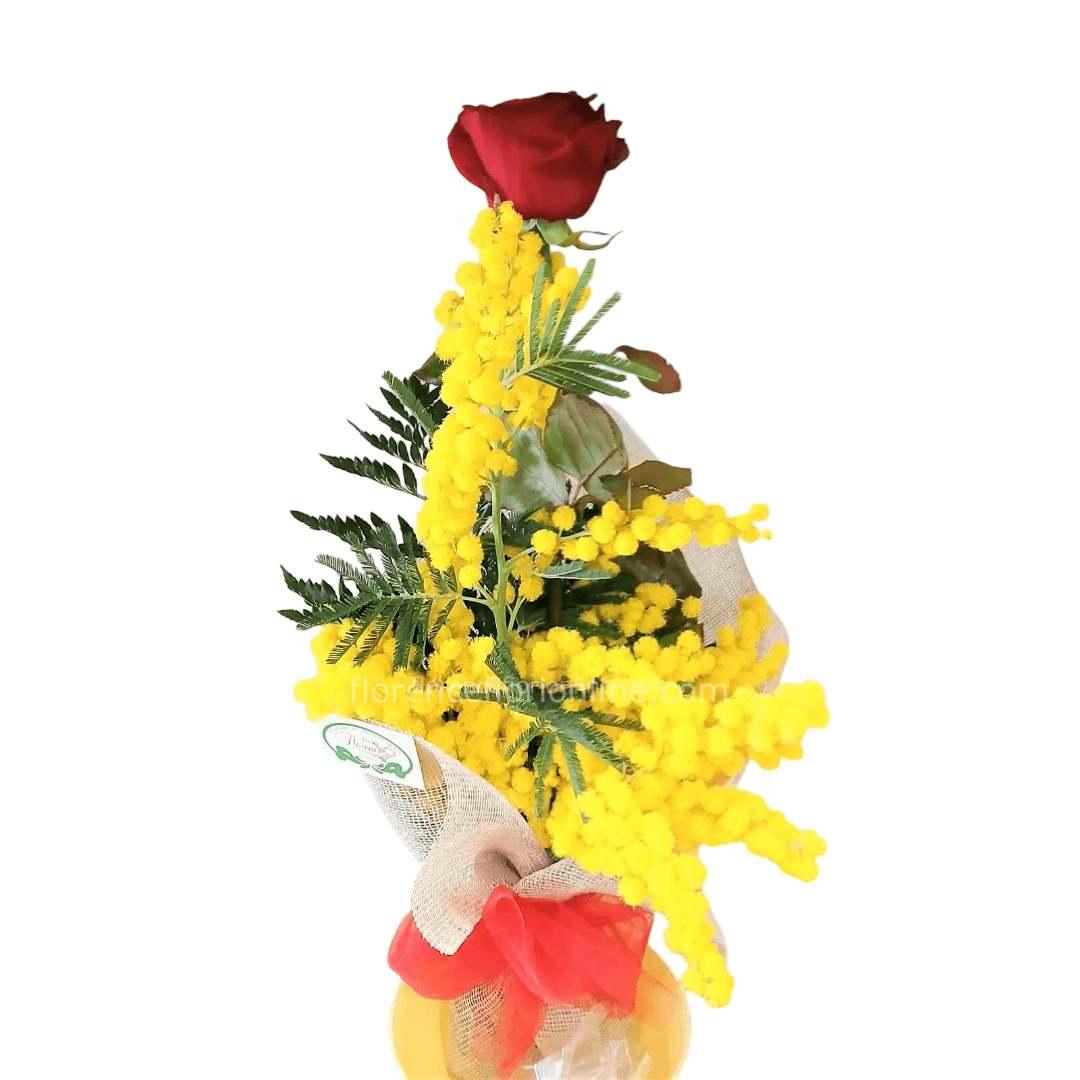 1 Rosa di prima scelta accompagnata da Mimosa, simbolo di forza e femminilità.