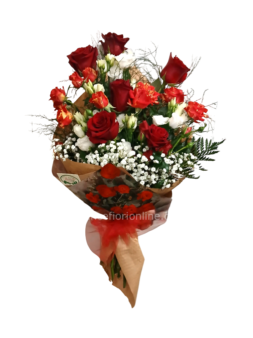 La composizione è realizzata con 5 rose rosse dal colore intenso, abbinate a delicate roselline a grappolo e impreziosite da fiori bianchi come il lisianthus, che donano luce ed eleganza all’insieme. Preparato artigianalmente dal fioraio con fiori freschi e disponibile con consegna a domicilio a Gaeta, Formia, Itri e Sperlonga.