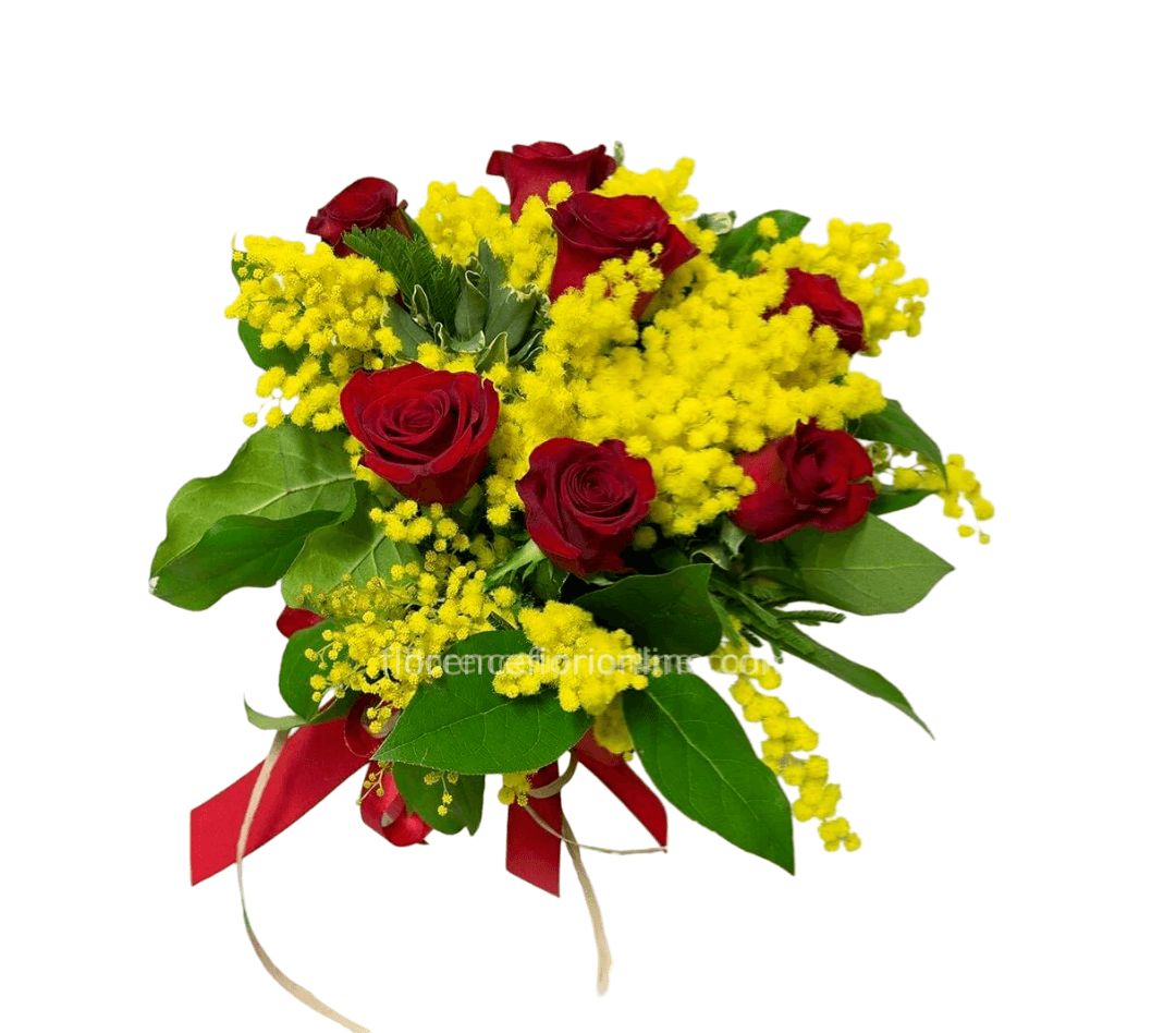 Elegante bouquet di rose rosse con mimosa di prima scelta, perfetto per un gesto romantico e primaverile.