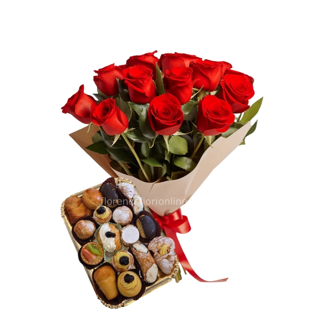 Rose rosse a scelta con vassoio di pasticcini assortiti (500 g).