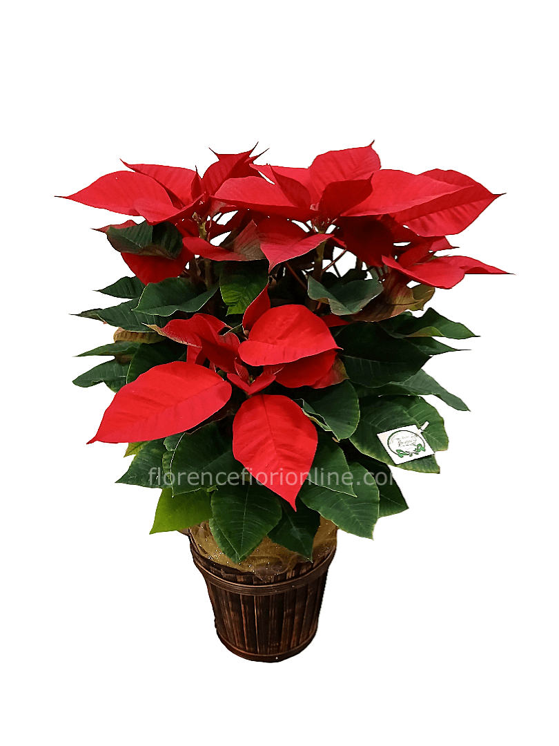 Caratteristiche principali: Altezza totale: circa 60 cm - Presentazione: cesto intrecciato decorativo incluso - Colore brattee: rosso brillante, tipico del periodo natalizio - Pianta viva di alta qualità, selezionata dai migliori produttori.