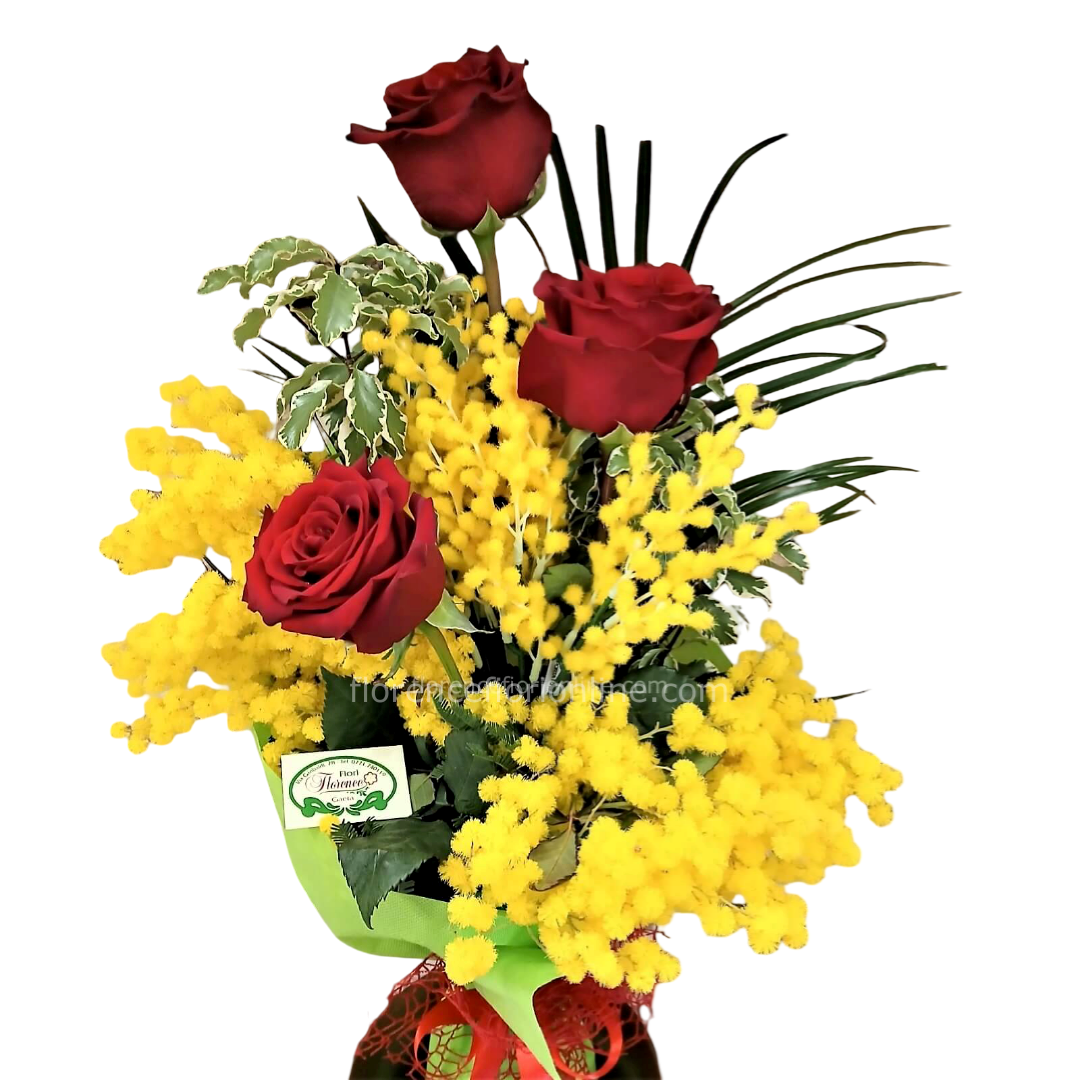 Celebra la Festa della Donna con un raffinato bouquet composto da tre rose fresche abbinate alla delicata mimosa, simbolo di forza, femminilità e amore. Perfetto per sorprendere una persona speciale con un tocco di eleganza e significato.